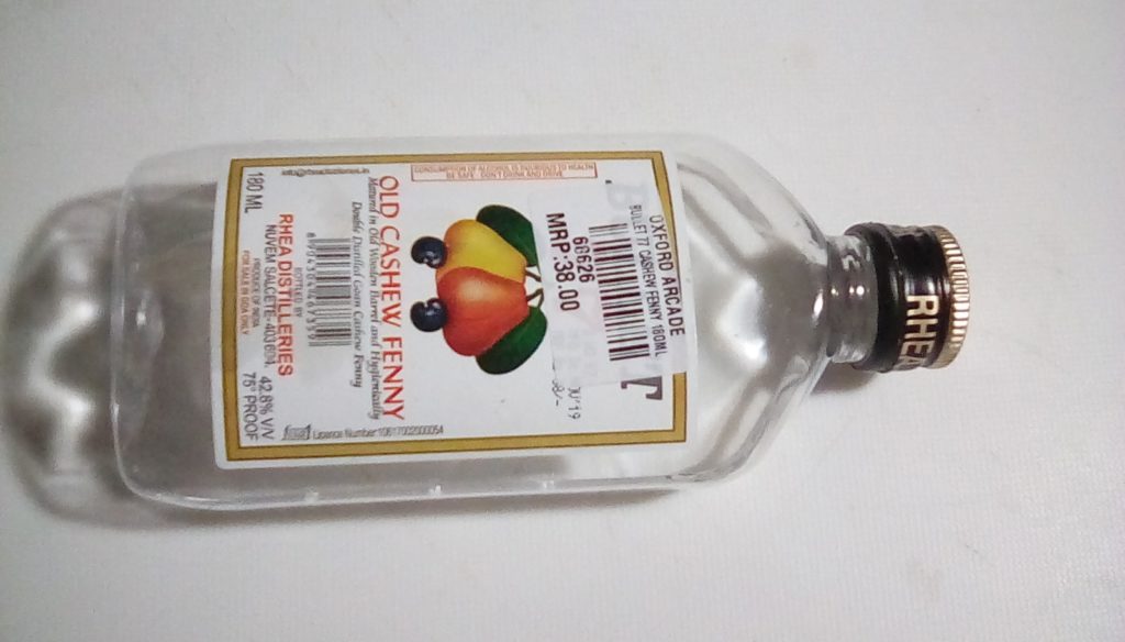 アルコール42.8度。ボトルはプラスチック製。ゴアでしか販売されていないし、ボトルにもその旨の記載がある。