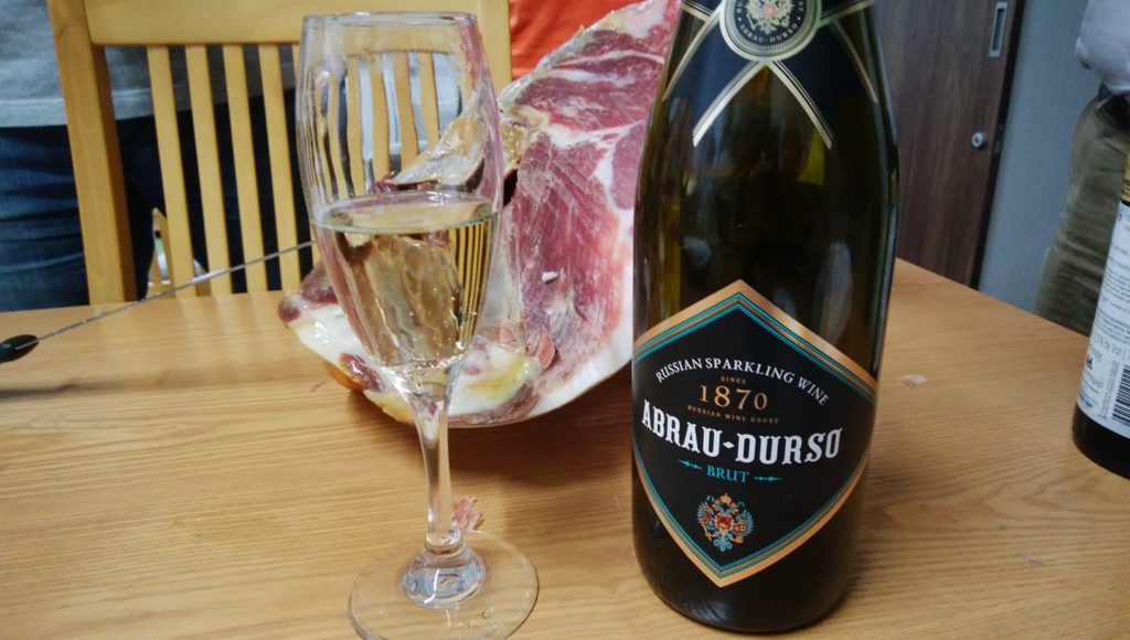 今回は「アブラウ・ドゥルソー」(Абрау Дюрсо)のスパークリング。昔の「ソビエトシャンパン」だ。ロシア革命(1917)以前は世界でも有数のワイン産地だったロシアで、ロシア皇室用に作られていたスパークリング。革命後にワイン業者はフランスに亡命して衰えていたが最近復活してきた、いわく付きのワイン。