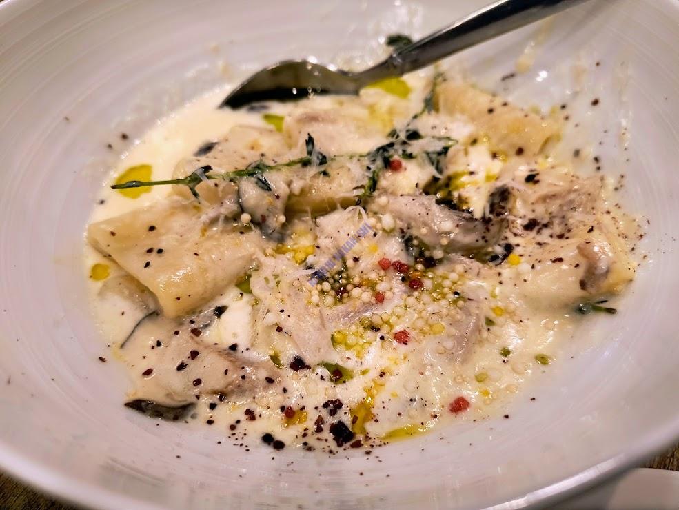 ウサギ肉のクリームパスタ。クリームが馴染む幅広の麺は店の手打ちなのかも。イタリア料理のようだが、ロシアでもウサギは獲れる。