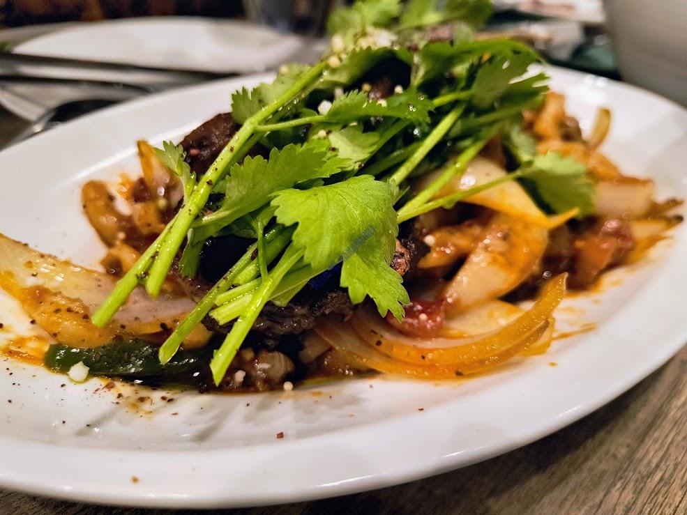 なんだかおしゃれなラグメン。ちょうどコリアンダーに隠れて見えないが、骨付ラムのグリルが乗っている。