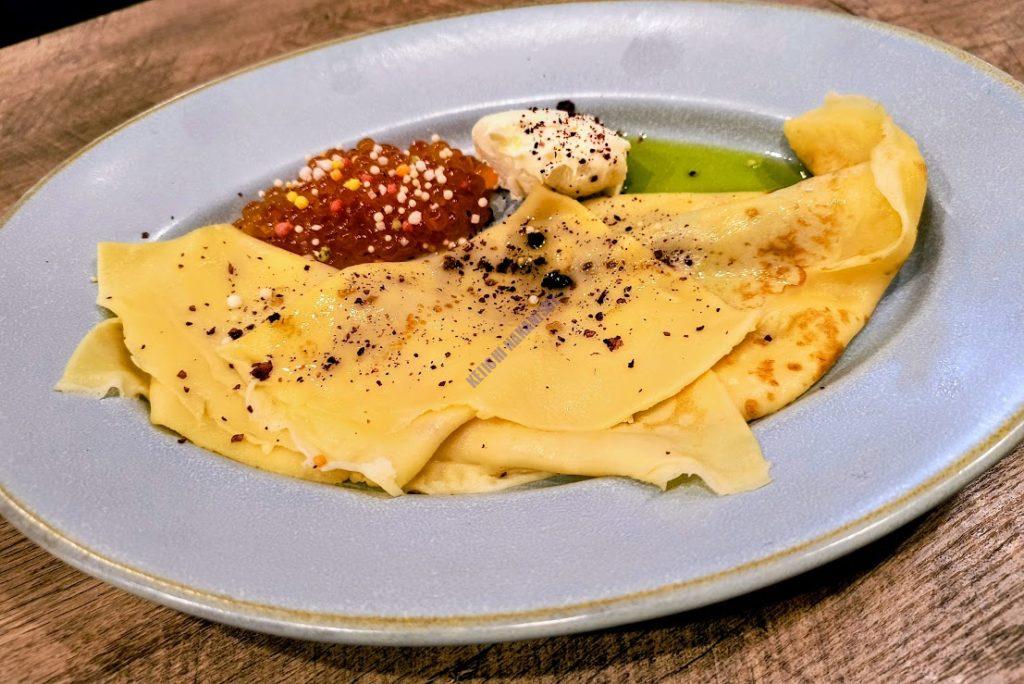 イクラのブリヌイ(クレープ)。