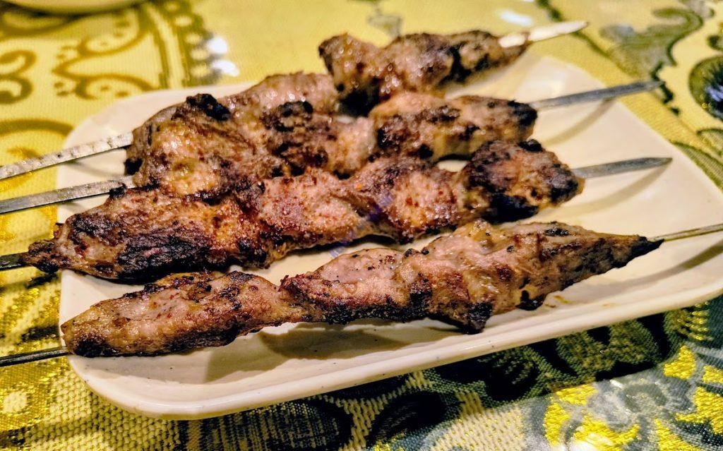 シシカワプ(羊の串焼き)。クミンの香る定番の焼き方。この店がと言うわけではなく専門店でも道端の屋台でも、炭火で焼いていればどこでも美味しい。モスリムは当然酒を飲まないのだが、ビールによく合う。