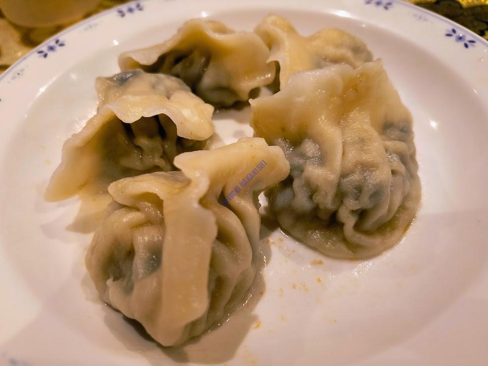 トゥギレ(羊肉の水餃子)。みんな美味しいと言って食べている。確かにそこまで羊肉の匂いは気にならないのだが。