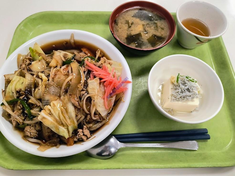 「野菜炒め丼」は見た目よりボリューム有り、これだけで十分お腹いっぱいになります。今回は丼ものだったのですが、定食はご飯とみそ汁はお替り自由です。